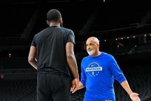 体育资讯10月23日讯 独行侠助教菲尔-汉迪更新社媒,晒出了训练时指导球员的照片。
