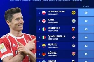 本世纪五大联赛对老东家进球榜:莱万29球居首,凯恩19球次席